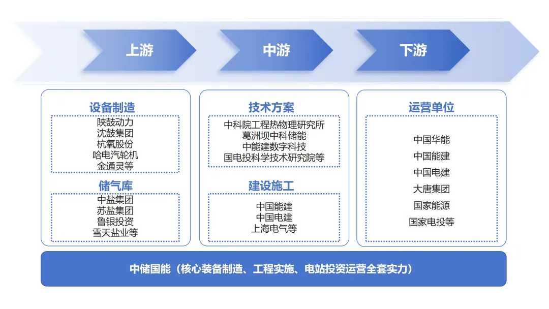 壓縮空氣儲能產業鏈長、覆蓋廣,上游產業為設備制造和儲氣庫,中游為技術提供及工程建設方,下游為投資運營商(業主單位),目前在研發和制造等核心環節無卡點,基本實現全環節國產化。