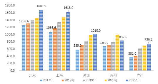 1  五城市2017-2021年生物醫(yī)藥工業(yè)產(chǎn)值規(guī)模(億元)