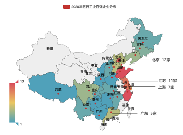 3 2020年中國醫(yī)藥工業(yè)百強(qiáng)企業(yè)分布熱力圖