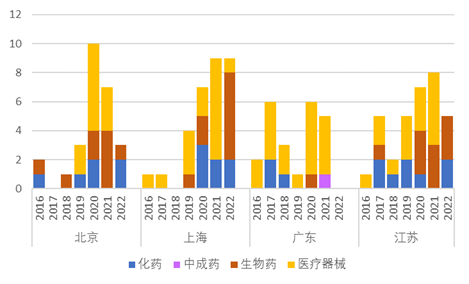 從上市企業(yè)看,北京布局多元化,上海和江蘇生物藥領(lǐng)域表現(xiàn)亮眼,廣東醫(yī)療器械實(shí)力領(lǐng)先。北京在不同領(lǐng)域都有實(shí)力強(qiáng)的上市藥企,如中藥領(lǐng)域有同仁堂集團(tuán),化藥領(lǐng)域有悅康藥業(yè),生物藥有天壇生物,器械有萬東醫(yī)療等。但近幾年上海和江蘇生物藥企業(yè)發(fā)展更勝一籌,2022年上海有6家生物藥企業(yè)上市,江蘇近三年保持每年有3家生物藥企業(yè)上市。廣東藥品企業(yè)上市呈下降趨勢,但醫(yī)療器械企業(yè)表現(xiàn)突出,自“十二五”以來上市數(shù)量最多,共計(jì)18家。