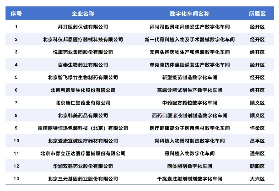表1 2022—2024年北京市生物醫藥領域數字化車間認定名單