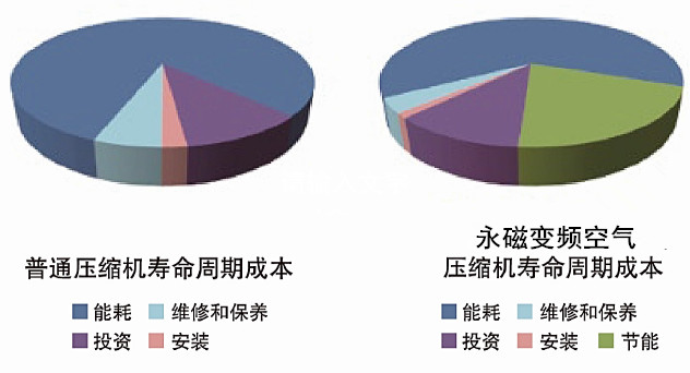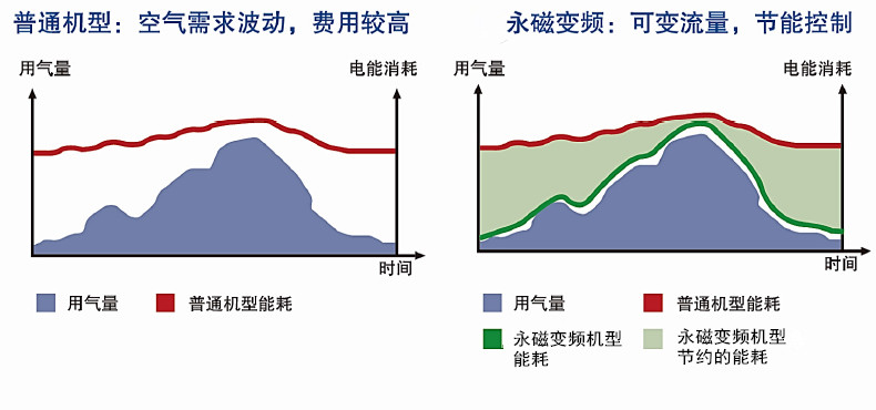 永磁變頻空壓機(jī)可以精確的滿足用戶的空氣需求。當(dāng)用戶的用氣量降低時,排氣量相應(yīng)地減少,同時能耗也按比例下降。通過先進(jìn)的變頻技術(shù),大大的減少了空壓機(jī)的卸載,使能耗大大下降。永磁變頻空壓機(jī)可跟蹤空氣需求量的變化自動調(diào)節(jié)電機(jī)轉(zhuǎn)速,平均節(jié)能可達(dá)50%。